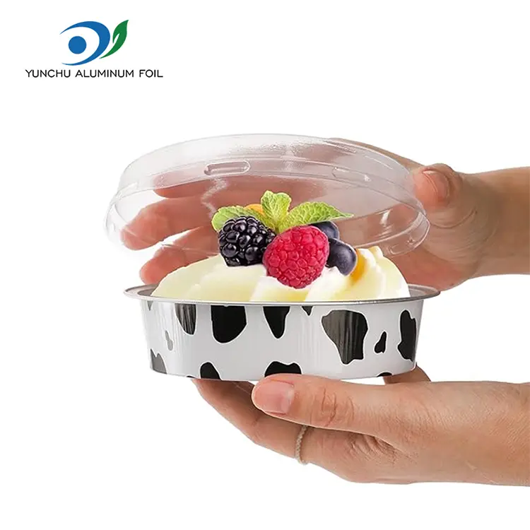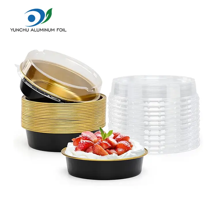 Birdəfəlik çörək qablaşdırma dəyirmi smootwall alüminium folqa qabları, üst: 110mm, 4.3 ", alt 100 mm, 4" Bazarda və müştərilər və fabriklər tərəfindən geniş tanınır. Nəqliyyat təhlükəsizliyi və məhsulun ekranı effektini təmin etmək üçün tam şəffaf pet material möhürləmə qapağına uyğundur.