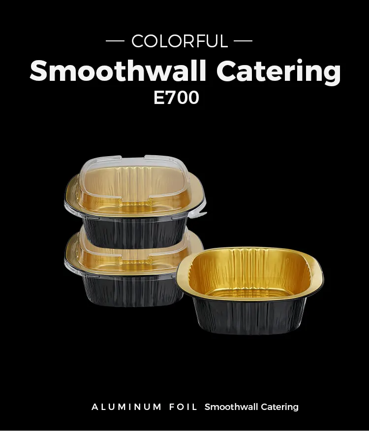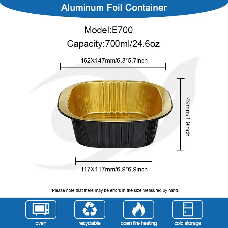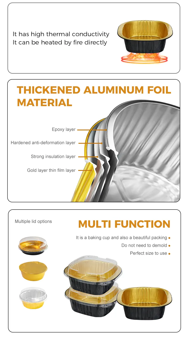 Yunchu Alüminium Folqa Təchizatçısının birdəfəlik binaural kvadrat qutusu qara qızılı yüngül divarlı alüminium folqa qabları qida dərəcəli 8011 alüminium ərintisi folqadan hazırlanır. Onlar səthdə sıx oksid təbəqəsi yaratmaq üçün yüksək temperaturda yumşalma və sterilizasiya prosesləri ilə işlənmişdir. Onların heç bir ağır metalları və qoxusu yoxdur. Onlar bütün növ qidalarla birbaşa təmasda ola bilər və yüksək temperaturda zərərli maddələrin çökməsinin qarşısını alır. İsti yeməklər, soyuq yeməklər, desertlər və ya souslar saxlamaq üçün istifadə olunmalarından asılı olmayaraq, onlar qida təhlükəsizliyini qoruya və FDA və SGS kimi çoxsaylı təhlükəsizlik sertifikatlarına uyğunlaşaraq, hər dişləməni daha təhlükəsiz edir. Unikal qara qızılı işıqlı divar dizaynı ənənəvi alüminium folqa qablarının monoton teksturasını pozur. Tutqun qara qızıl örtük və hamar divar səthi yüksək səviyyəli hiss gətirir. O, təkcə əla görünüşə malik deyil, həm də işığın və oksigeni effektiv şəkildə blok edə bilər, yeməyin oksidləşməsini gecikdirir, yeməyin aromasını və nəmini möhkəm bağlayır, qoxunun ötürülməsindən qaçır və uzun müddət yeməyin orijinal dadını saxlaya bilir. Hamar divar səthində yivlər və qırışlar yoxdur, bu da bakteriyaların çoxalma ehtimalını azaldır və təmizlənməsi asandır. O, həmçinin çap fərdiləşdirməsinə daha yaxşı uyğunlaşa bilər, iaşə brendlərinə onların tanınmasını və keyfiyyətini artırmağa kömək edir.