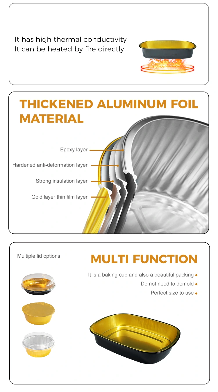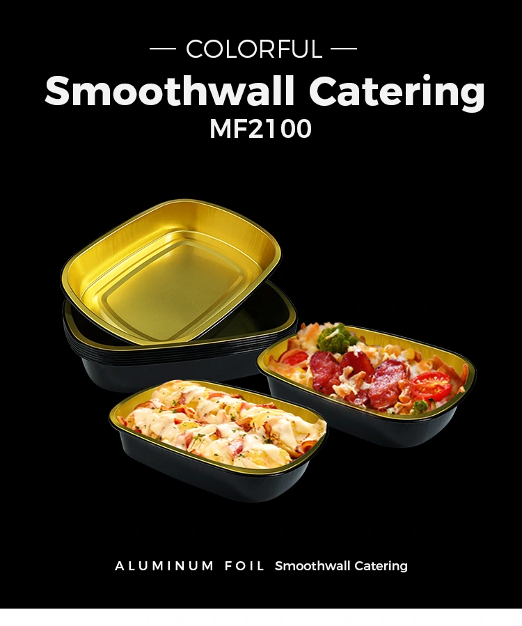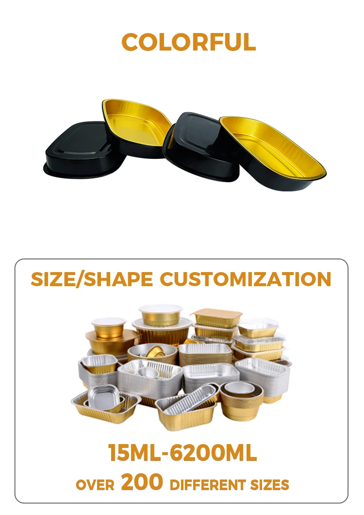 Yunchu Alüminium Təchizatçı Birdəfəlik Qara Qızıl Yeməkləri Düzbucaqlı Alüminium Folqa konteynerləri, xüsusilə bişirmə zəncirləri və özünə xidmət zəncirləri və digər ssenarilərdən ibarət olan geniş həcmli və digər ssenarilərə uyğundur, hündürlüyü, qızardılmış balıq, güveç və digər qidalar üçün uyğundur, alüminium ilə istifadə edilə bilər Mükəmməl möhürləmə performansı, yüksək temperatur müqavimət və yağ və sızma funksiyası olan tam şəffaf qapağı olan folqa möhürləmə qapağı və pet tam şəffaf qapağı. Yemək qablaşdırması, istilik, soyuducu və qəbulu, məsələn, müxtəlif ssenarilərdə geniş istifadə olunur. Səth, yüngül bir divar dizaynı, istilik möhürlü filmin avtomatik möhürlənməsi üçün əlverişli olan, bununla da qablaşdırma səmərəliliyini yaxşılaşdıran düz və hamar bir görünüşlü bir işıq dizaynı qəbul edir.