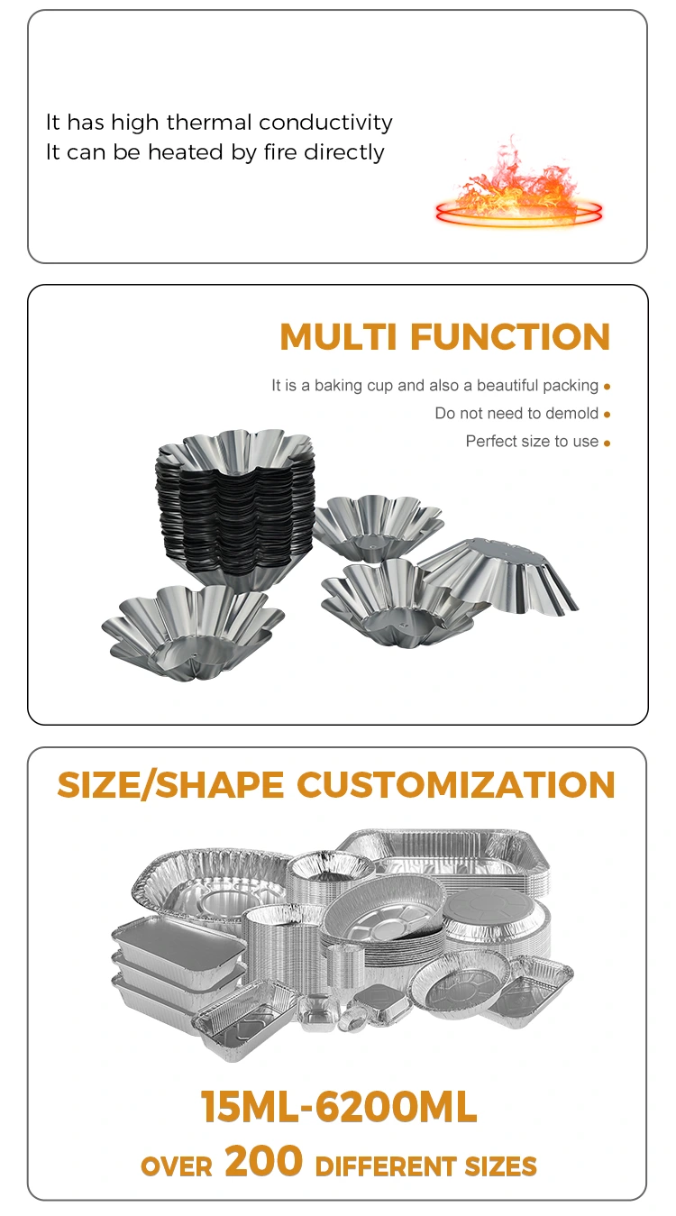 Yunchu Alüminium Folqa Təchizatçı Birdəfəlik Xrizantema Yüngül Yumurta Tart Tutacağı Gümüş Alüminium Folqa Konteyneri Alüminium folqa materialı əla istilik keçiriciliyinə malikdir və -20 ° C-dən 250 ° C-ə qədər yüksək və aşağı temperaturlara davam edə bilər. Sabit molekulyar quruluşa malikdir və yüksək temperaturda bişdikdə deformasiyaya uğramır, ərimir və solmur. İstiliyi tez keçirə bilir və təmiz olmayan dizayna malikdir. O, bişdikdən sonra yorucu təmizlik işləri ilə vidalaşaraq, vaxta və işçi qüvvəsinə qənaət edərək birbaşa atmaq olar.