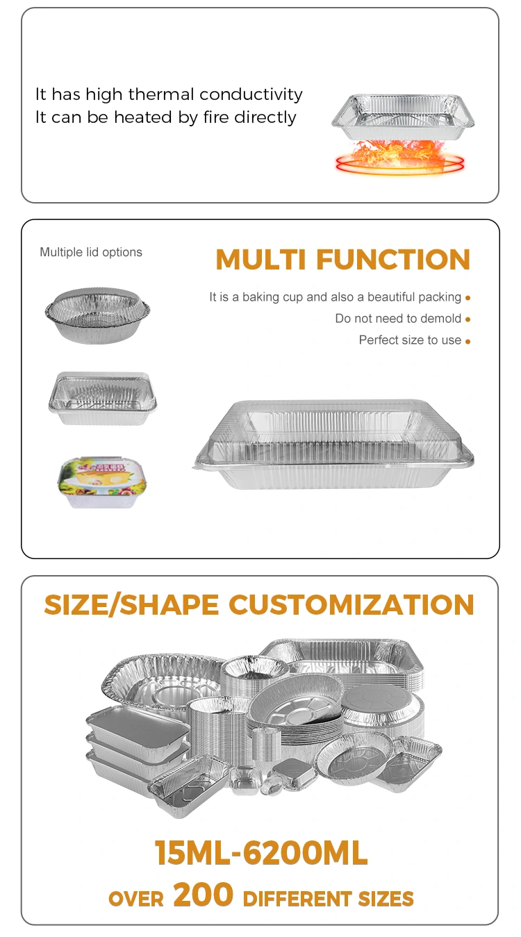 Xüsusiyyətlər: Bu böyük tutumlu çörək bişirmə qabı Gümüş folqa konteyneri, qida dərəcəli əlaqə standartına tam cavab verən, özünəməxsus qoxu olmadan qida təhlükəsizliyi standartını tam şəkildə qarşılayan və daha çox istifadə edilməsini təmin edən ərzaq səviyyəsində olan 8011-0 alüminium folqa materialından hazırlanmışdır. İstifadəsi daha etibarlı olan bir konkav və konveks daxili dizayna malikdir. Avadanlıq təmizləyici və avadanlıqların astarını yaxşı qoruyur. Açıq alov üzərində çörək və ya istilik istərsə də, konteyner deformasiyasından və ya qida təhlükəsizliyinə təsir etməkdən narahat olmağa ehtiyac yoxdur.