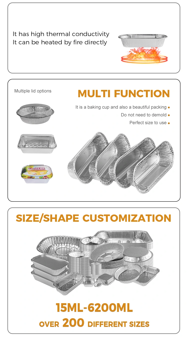 Square Hava Fryer Gümüş Alüminium Folerher Konteyneri yüngül və davamlı olan yüksək keyfiyyətli alüminium folqa materialından hazırlanmışdır. Üst, özelleştirilebilir bir ev heyvanı şəffaf qapağı ilə təchiz olunmuşdur və altındakı qidanın çörək qabına yapışmasının və təmizlənməsini effektiv şəkildə maneə törədən, eyni zamanda nəqliyyat və istifadəni asanlaşdıran bir qapaq şəklində quraşdırılmışdır.
