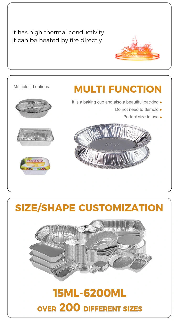 Xüsusiyyətlər: Bir parça qəlibli qəliblər qalınlaşmış və bişmiş, qida əlaqə dərəcəli alüminium folqa materialı qəbul etmək, qida ilə əlaqə qurmaq, sızma, güclü qalınlıq, korroziya müqaviməti, yüksək temperatur müqavimətinə malikdir.