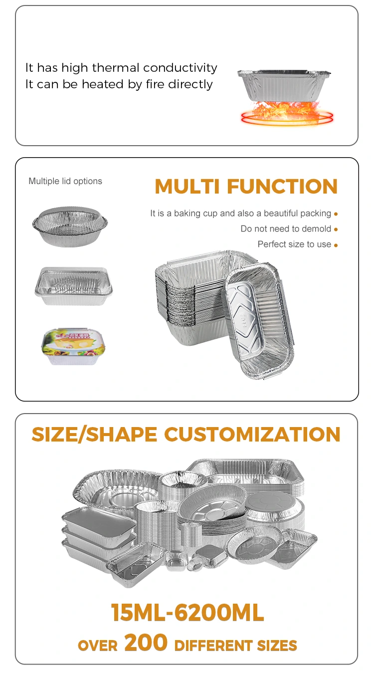 Xüsusiyyətlər: Təqdim etdiyimiz Alüminium Foil nahar qutusu, əla istilik qorunması performansına malik 801 alüminium folqa materialından hazırlanır və yeməyin temperaturunu effektiv şəkildə qoruyub saxlayaraq yeməyinizi daha cəlbedici edir. Xüsusilə, düzbucaqlı bişmiş düyü gümüş alüminium folqa qablarımızın nəinki istilik izolyasiya xüsusiyyətləri yoxdur, lakin loqotiplərin fərdi qaydalarını asanlaşdırmaq üçün alüminium folqa qapaqları və ya pet plastik qapaqları ilə birləşdirilə bilər, bununla da müştəri yaddaş nöqtələrini artırır və marka şüurunu artırır.