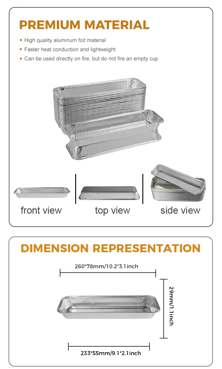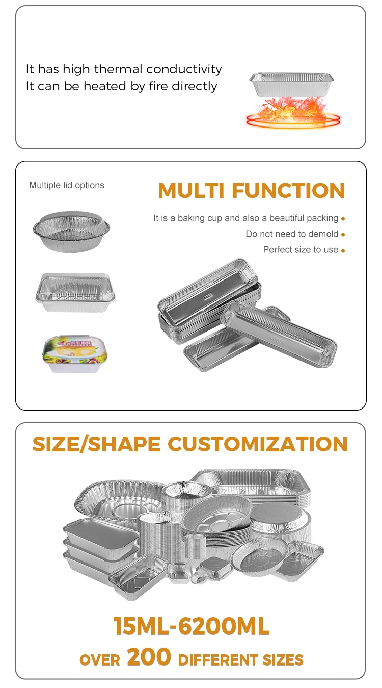 Xüsusiyyətlər: Nahar qutusu Topdansatış, yaxşı istilik qoruğu təsiri olan 8011 alüminium folqa materialından hazırlanmışdır və yeməyin temperaturunu saxlaya bilər, yemək daha dadlı və ləzzətli hala gətirir. Bundan əlavə, düzbucaqlı BBQ gümüş alüminium folqa qabı da istilik izolyasiya funksiyası da var və alüminium folqa qapağı və pet plastik qapağı ilə uyğunlaşdırıla bilər.