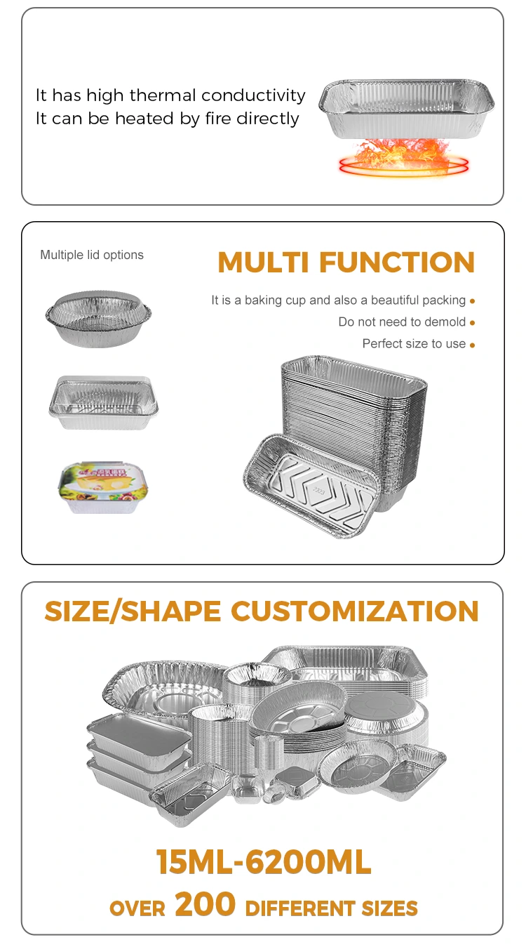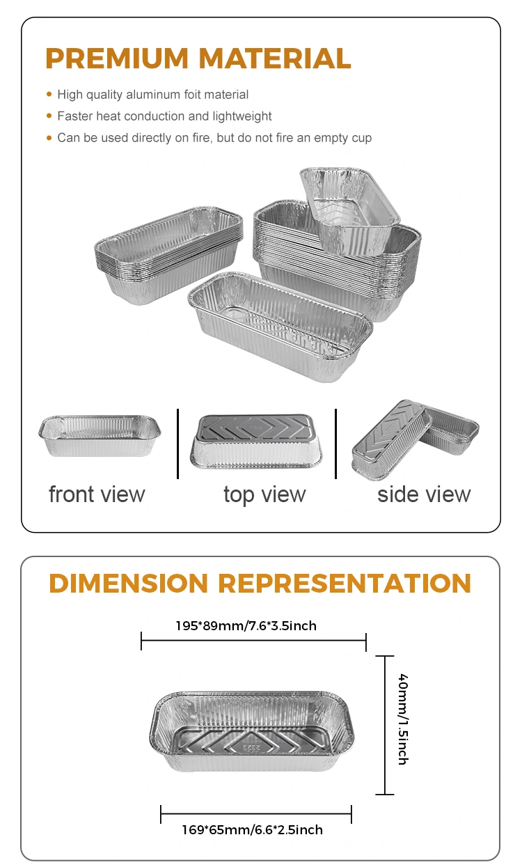 Xüsusiyyətlər: nahar qutusu Topdansatış 8011 alüminium folqa materialı, yeməyin temperaturunu qoruya bilən və yeməkləri daha ləzzətli hala gətirə bilən yaxşı istilik qoruğundan hazırlanmışdır. Bundan əlavə, düzbucaqlı barbekü gümüş alüminium folqa konteynerimiz də loqotipinizi düzəltmək, müştəri təəssüratını daha da dərinləşdirmək və marka imicinizi inkişaf etdirmək üçün rahat olan alüminium folqa kağızı qapağı və pet plastik qapağı ilə uyğunlaşdırıla bilər.