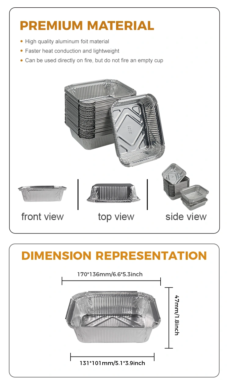 Praktik xüsusiyyətlərinə əlavə olaraq, Yunchu Təchizatçısının Model 2056 Düzbucaqlı Gratin, Gümüş Alüminium folqa qabları da müasir dizayn konsepsiyasına sahibdir. Onun yuvarlaq forması və gümüş görünüşü, ənənəvi gümüş folqa dizayn tərzini üstələyərək şık bir görünüş verir. Fərqli markaların ehtiyaclarını ödəmək üçün, qızıl, qara qızıl, qırmızı və qara, o cümlədən müxtəlif özelleştirilebilir rəng seçimlərini təklif edirik və xüsusi rənglər, loqotiplər və naxışlar üçün özelleştirme xidmətləri göstərə bilər (xüsusi moQ və spesifikasiyalar üçün müştəri xidməti işçilərimizlə məsləhətləşin).