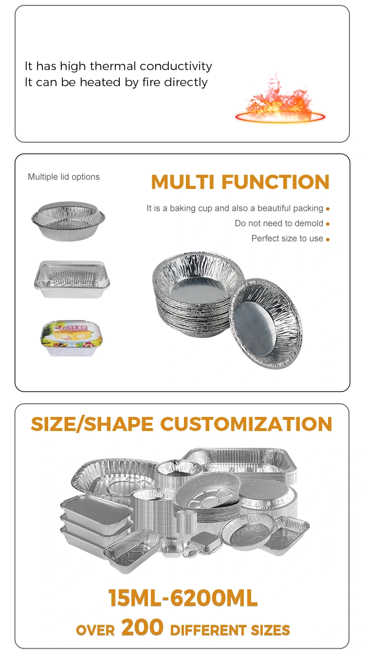 Qəlyanaltılar üçün bu dəyirmi yumurta tartı Gümüş alüminium folqa qida konteyneri 8011 qida əlaqə dərəcəsi alüminium folqa materialından hazırlanmışdır, qida ilə təmasda təhlükəsizliyi təmin etmək və sızdırmaq asan deyil. Onun qalınlığı güclü, korroziyaya davamlı, yüksək temperaturda müqavimət və daha uzun xidmət həyatıdır.