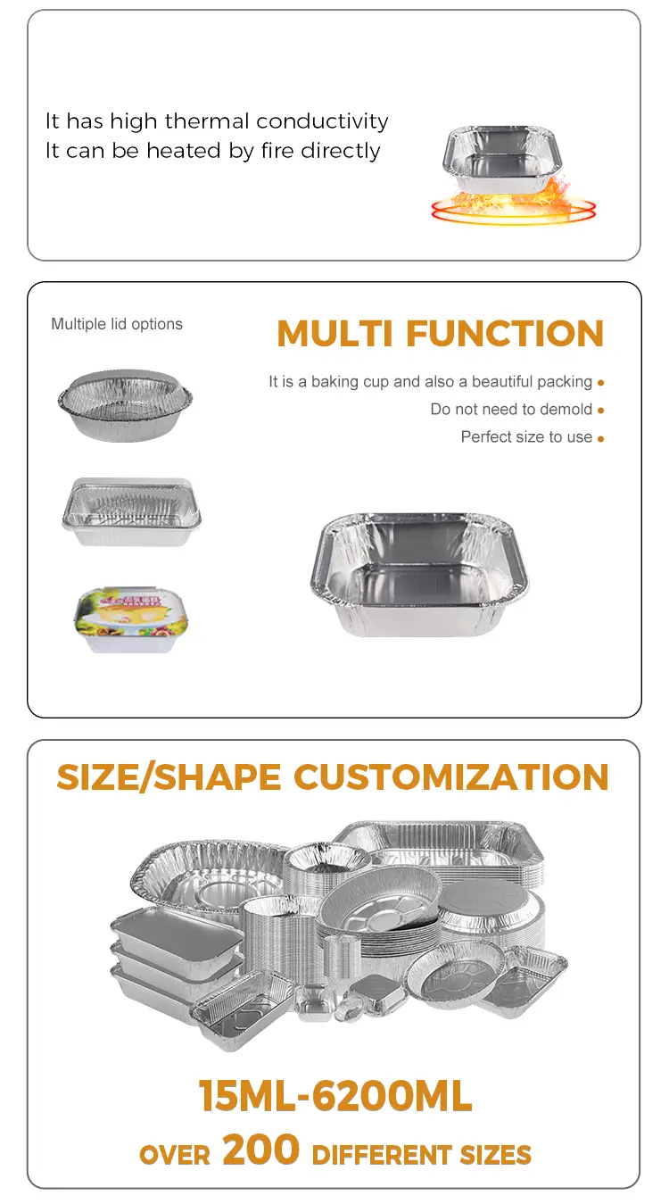 Yunchu Alüminium Təchizatçı Meydanı Tort Hava Forer Gümüşü Alüminium Foleratorları da, soba çörək, hava qızdırıcısı, açıq alovlu isitmə və digər avadanlıqlardan istifadə etmək üçün asanlıqla istifadə edilə bilər Kiçik tortlar, evdə hazırlanan qatıq, jele puding, bişmiş yumurta, dəniz məhsulları və digər qidalar, alt konveks dizaynı, sürüşməyən bir rol oynayır, tam qıvrımlı kənar dizaynı, temperaturun temperaturu və ləzzətini bağlamaq üçün tam şəffaf bir qapaq ilə istifadə edilə bilər.
