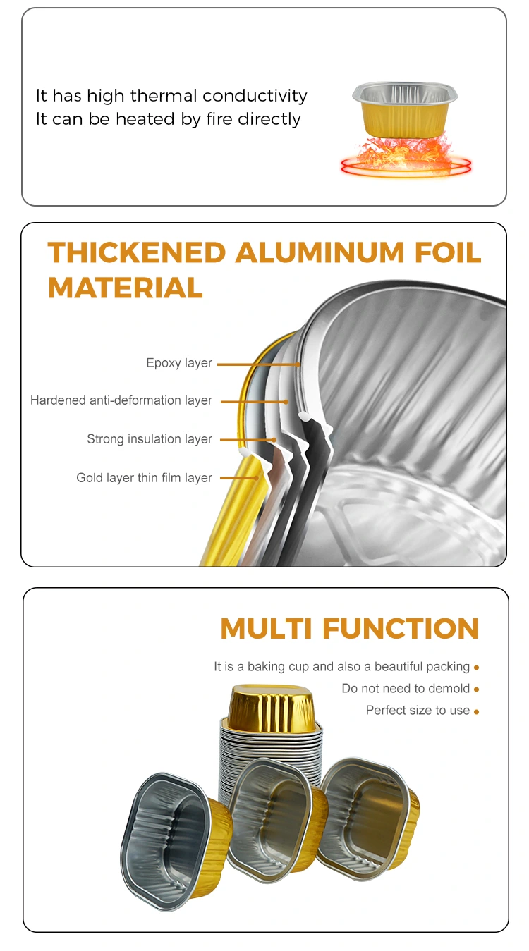 Həm gözəl, həm də funksional, həm də funksional, kvadrat desert çörək stəkanları hamar bir alüminium folqa konteyneri, solmadan yüksək temperaturdan yapışmaq üçün hazırlanmışdır. 8011-0 materialdan hazırlanmışdır və maksimum istilik davamlı temperaturu 660 ° C-ə qədərdir. Ümumi mətbəx avadanlığı, həmçinin 200 ° C-yə çata bilər, yeməyin yanmayacağını və ya çatlamayacağını təmin edə bilər. Qalın materialdan hazırlandığı üçün, dəfələrlə istifadə edilə bilər. Hər şey dörd qat texnologiyası ilə işlənmişdir. Yeməkdən sonra onu götürə və deformasiyadan narahat olmadan onu yeyə bilərsiniz. Bundan əlavə, təmizləmək də çox rahatdır və gigiyena saxlamaq üçün birbaşa maddələrlə əlaqə saxlaya bilərsiniz.